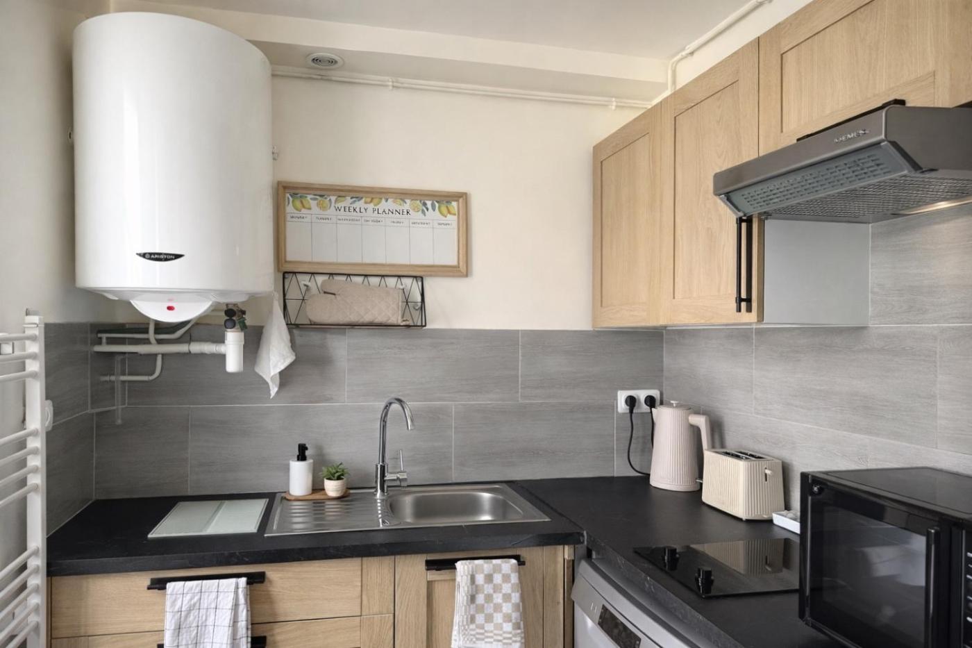 Appartement 1 Chambre. Featuring a private entrance, this apartment is comprised of 1 living room, 1 separate bedroom and 1 bathroom with a shower and a hairdryer. Meals can be prepared in the kitchen, which is fitted with a stovetop, a refrigerator, a dishwasher and kitchenware. The apartment offers a flat-screen TV, a washing machine, soundproof walls, a tea and coffee maker as well as garden views. The unit offers 2 beds.