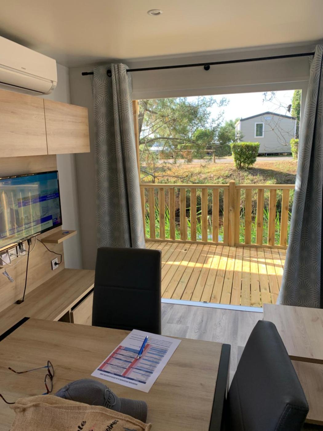 Envie d un break de paysages sauvages et de nature ce mobile home neuf tout confort climatise idealement situe au bord de l eau dans un camping 4 etoiles vous attend pour un week end quelques jours ou des vacances en famille