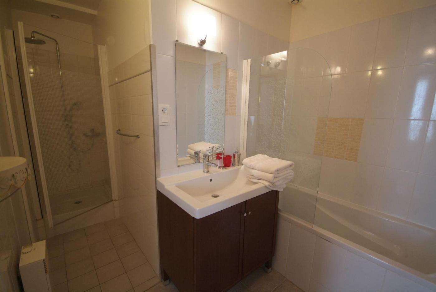 Appartement 2 Chambres. Boasting a private entrance, this apartment comes with 1 living room, 2 separate bedrooms and 2 bathrooms with a walk-in shower and a hairdryer. The well-equipped kitchen has a stovetop, a refrigerator, a dishwasher and kitchenware. Featuring a terrace with garden views, this apartment also features a washing machine and a flat-screen TV. The unit has 3 beds. ;