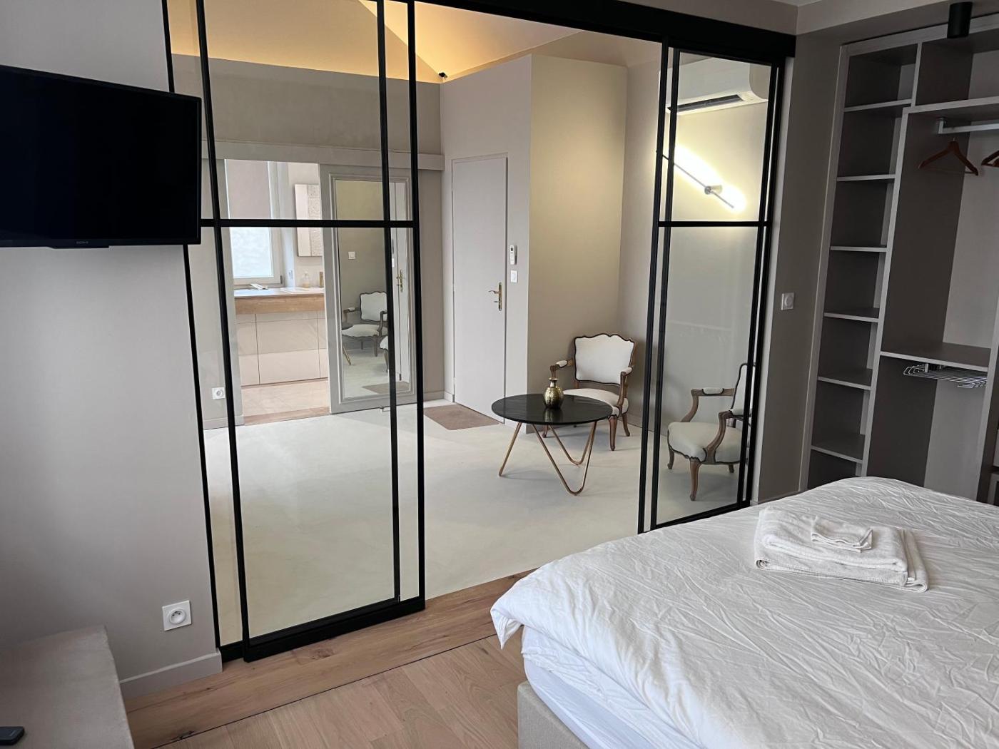 Chambre Double. The double room features parquet floors, heating, as well as a private bathroom featuring a walk-in shower and a hairdryer. The spacious air-conditioned double room provides a flat-screen TV with streaming services, a private entrance, a coffee machine, a dressing room as well as river views. The unit offers 1 bed.