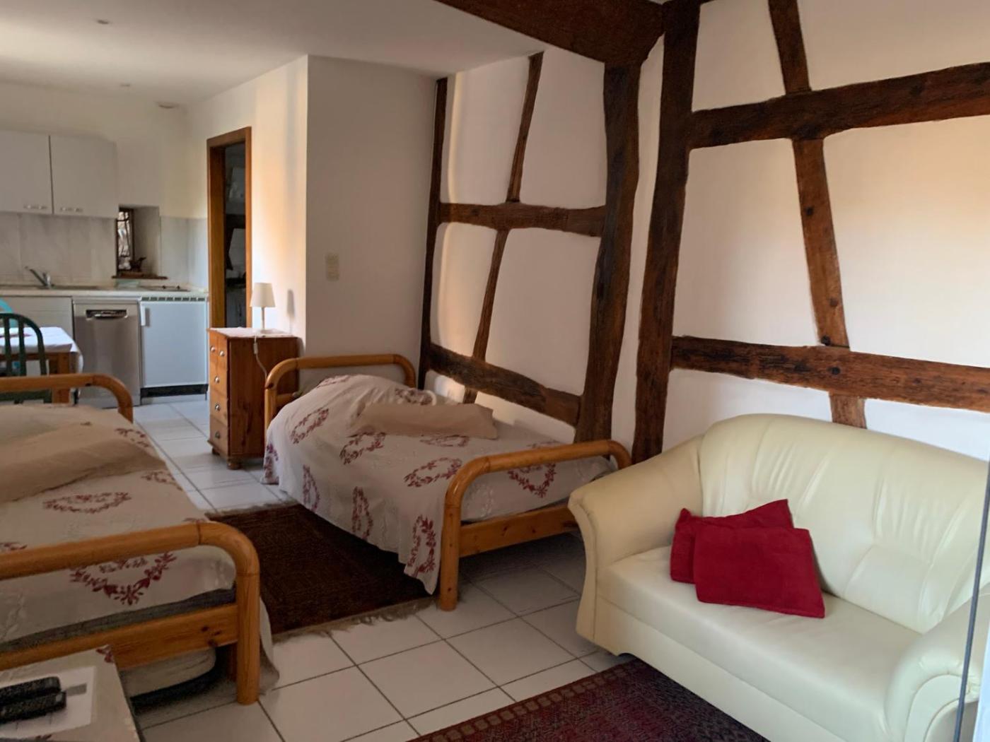 Chambre Triple. Offering bathrobes, this triple room includes a private bathroom with a bath and a hairdryer. In the fully equipped kitchen, guests will find a stovetop, a refrigerator, a dishwasher and kitchenware. The spacious triple room offers a coffee machine, a dining area, a wardrobe, a flat-screen TV with satellite channels, as well as garden views. The unit has 2 beds. ;