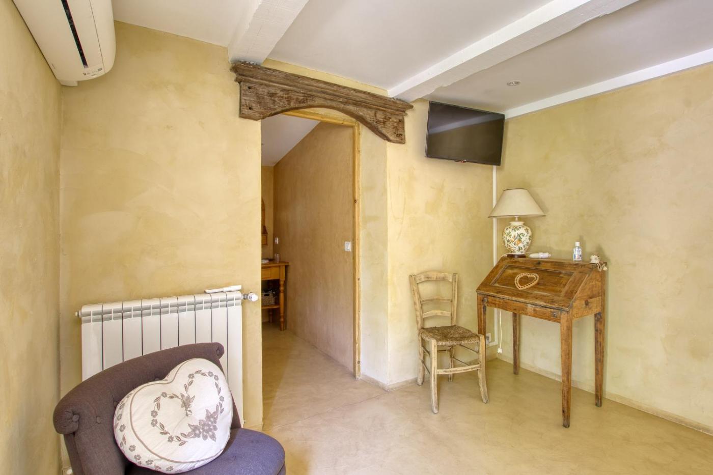 Chambre Double. Cette chambre double climatisée dispose d’une entrée privée, d’une terrasse offrant une vue sur le jardin et d’une salle de bains privative avec une douche à litalienne. Le logement comporte 1 lit. ;