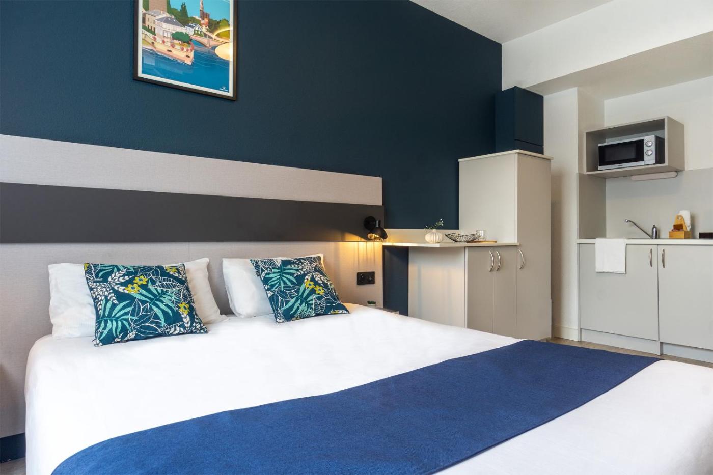 Studio Lit Jumeaux Confort. Ce studio dispose de la climatisation, de murs insonorisés ainsi que dune salle de bains privative avec baignoire ou douche. La kitchenette bien équipée est munie de plaques de cuisson, d’un réfrigérateur, d’un micro-ondes et d’ustensiles de cuisine. Ce studio est doté d’un plateaubouilloire, d’un coin repas, d’une armoire, du chauffage et d’une télévision à écran plat. Ce logement comporte 2 lits. ;