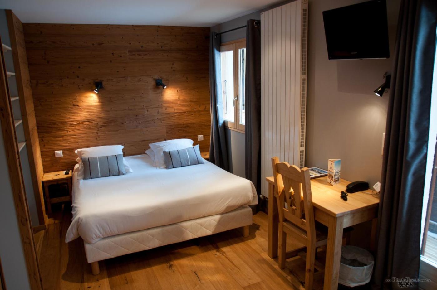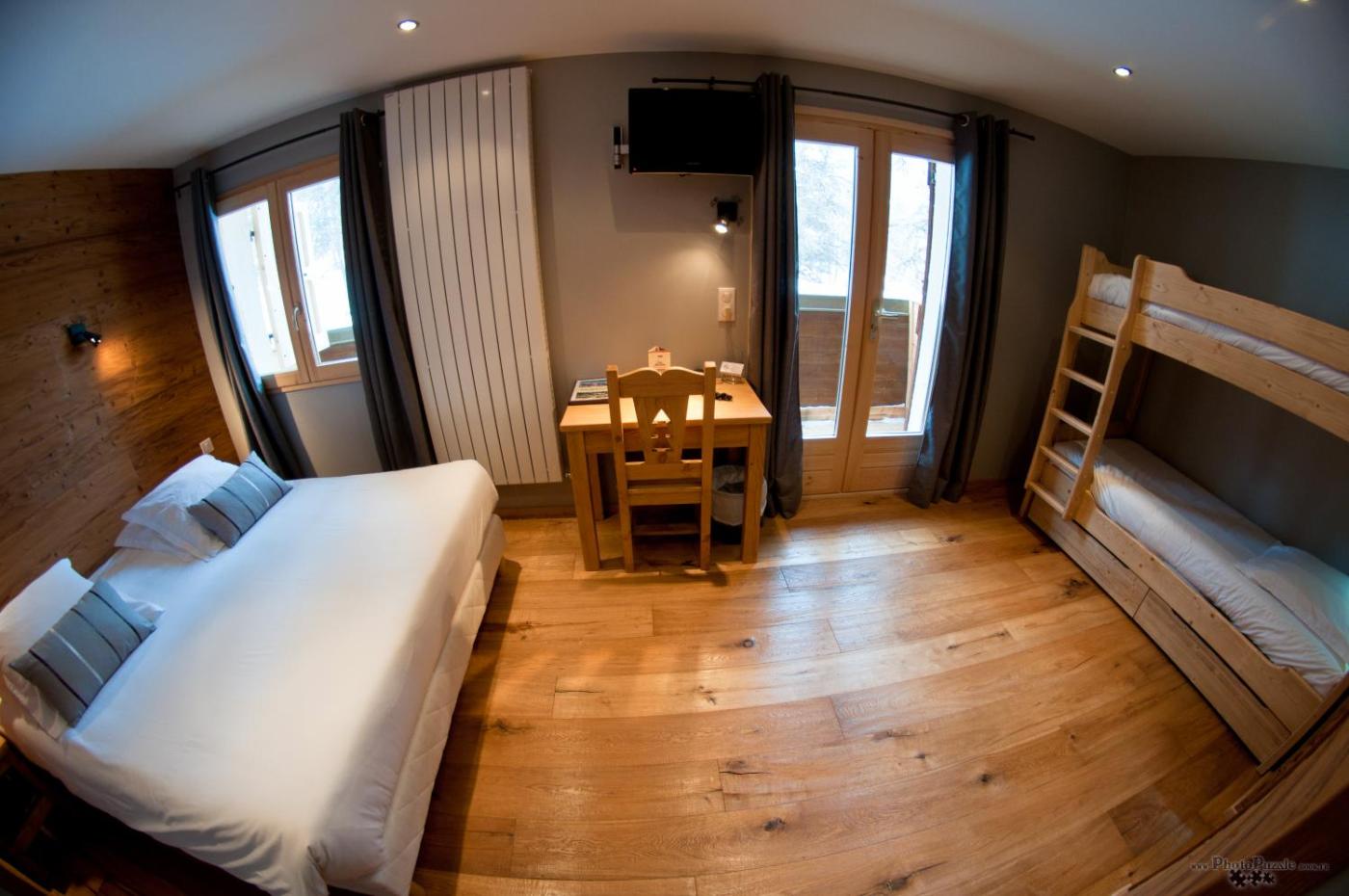 Chambre Quadruple Premium. This quadruple room is comprised of a flat-screen TV with satellite channels, a private bathroom as well as a balcony with mountain views. The unit has 2 beds. ;