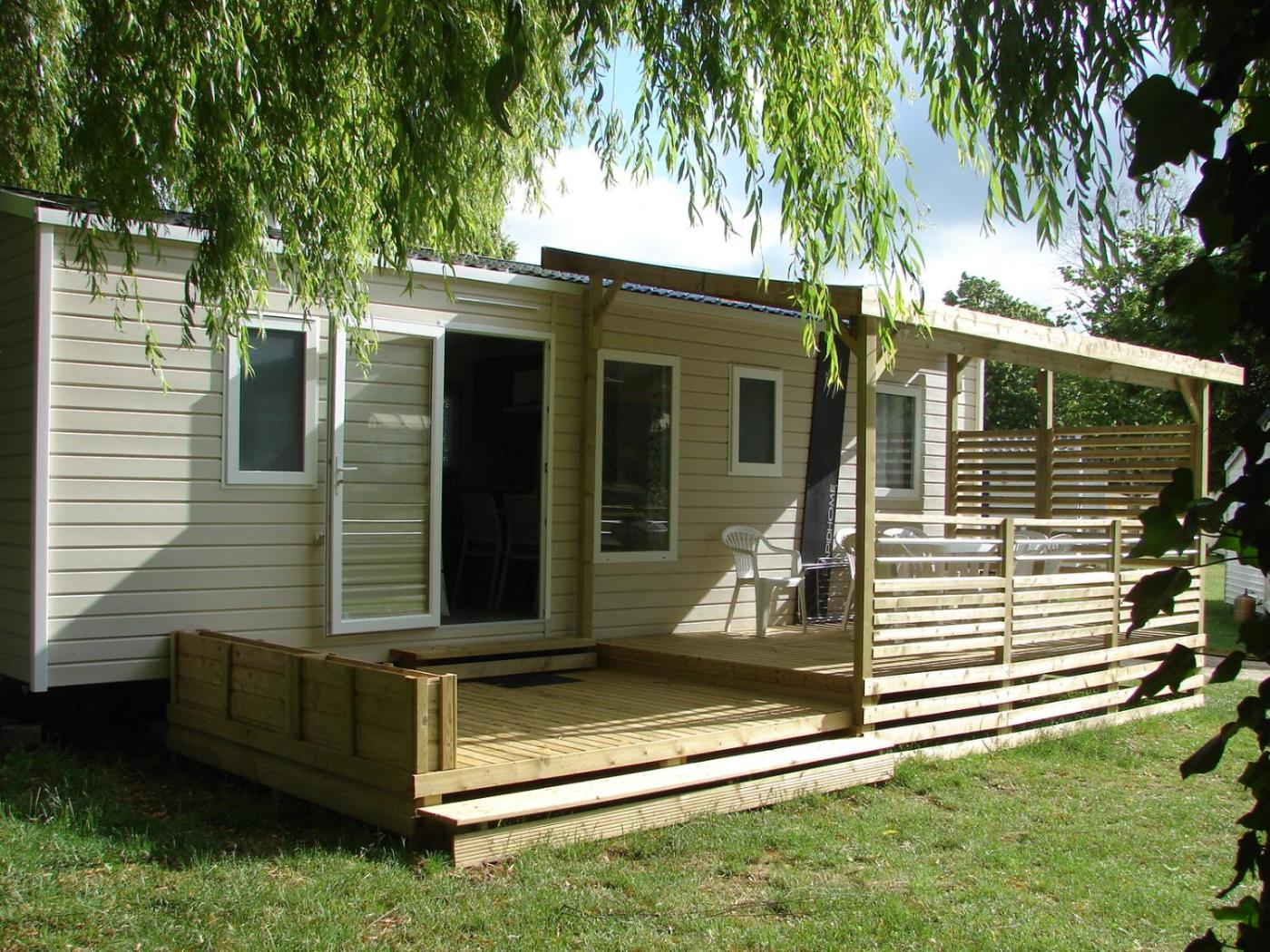 Mobile Home 2 Chambres (4 Personnes). Ce mobile home comprend une terrasse meublée, un coin jardin, une kitchenette intérieure équipée et une salle de bains privative. ;