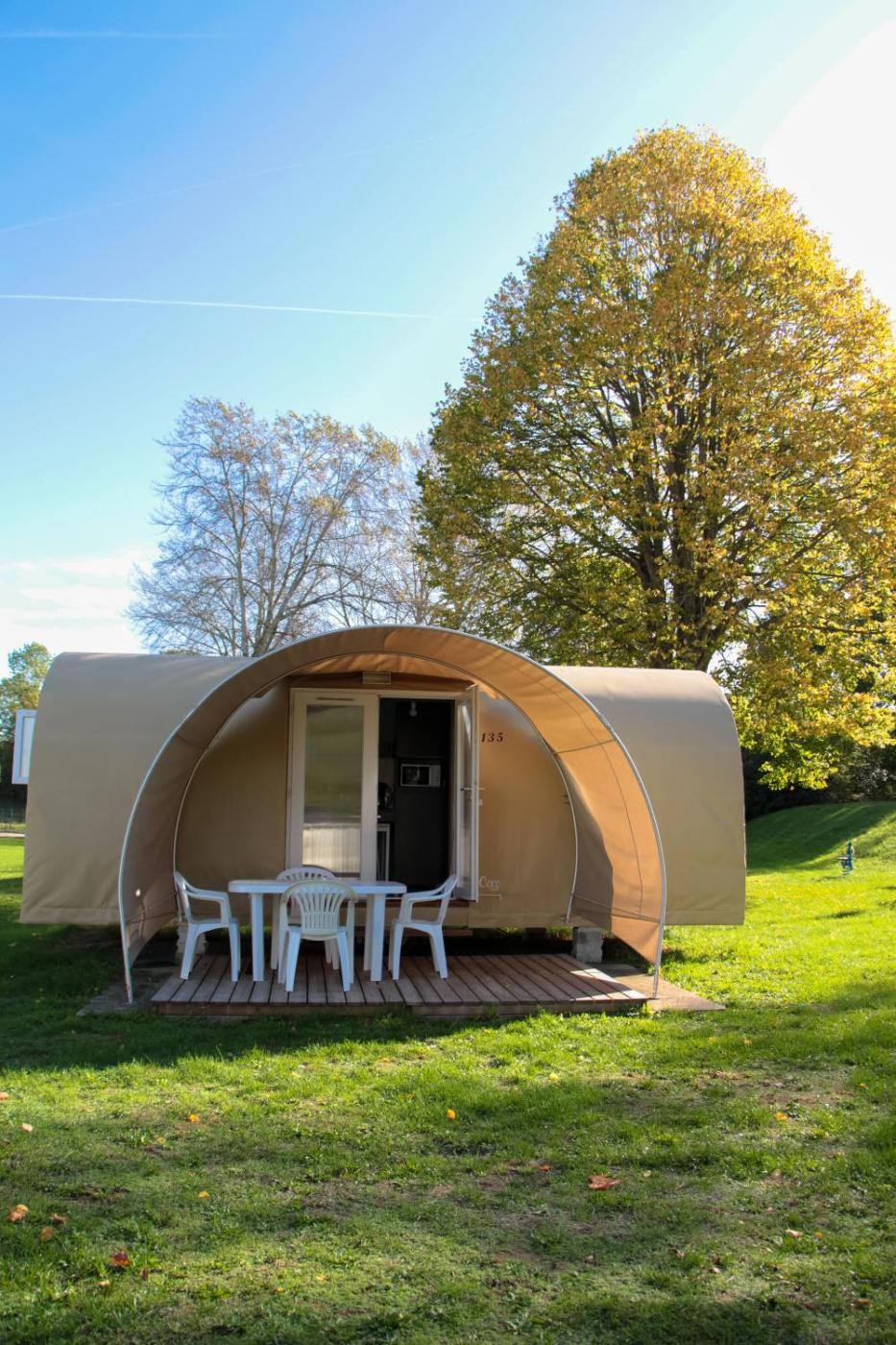 Tente (2 à 4 Personnes). Guests can make meals in the kitchenette that features a stovetop, a refrigerator, kitchenware and a microwave. This tent has a shared bathroom, a private entrance, a coffee machine as well as a terrace. The unit has 3 beds. ;